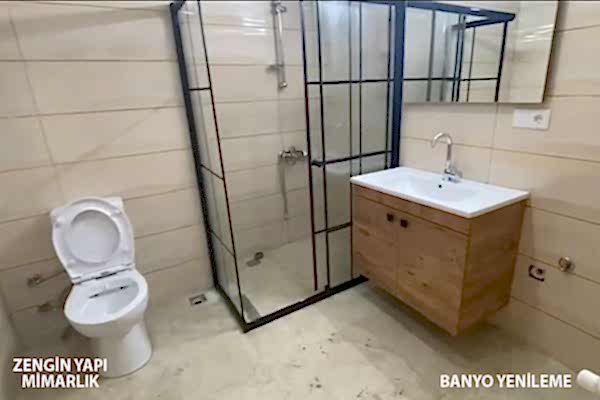 - Tuvalet ve banyoda tüm tesisat ve yalıtım işlemlerinin sonrasında gerekli düzeltmeleri yaptık. Sonrasında da seramik kaplamalar ve duşakabin, tuvalet taşı gibi montaj işlemlerini tamamladık.