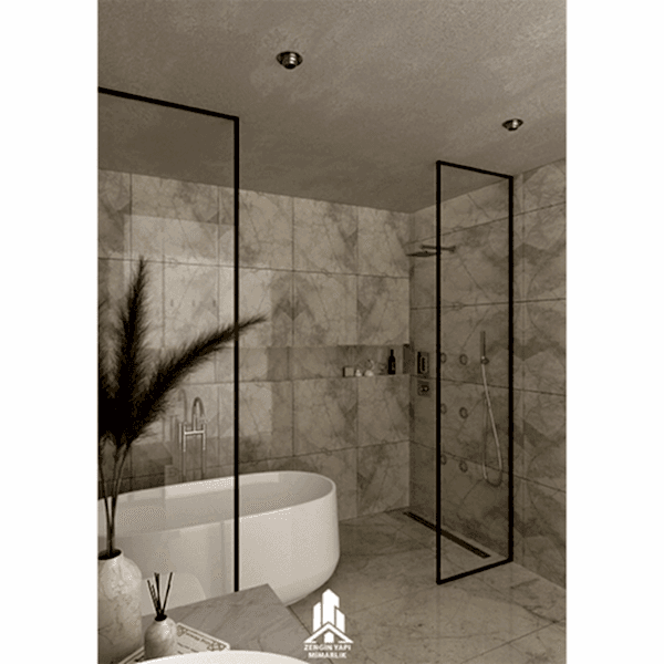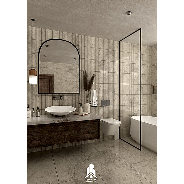 Banyo Tasarımımız: Modern ve ferah hissetiren, sessiz lüks trendine uyan minimalist banyomuz. ( Mekan: 250cm x 340cm x 270cm )